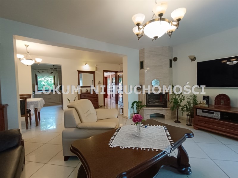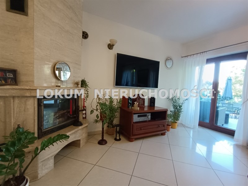 Parter- salon z wykuszem, kominkiem i wyjściem na taras, kuchnia, łazienka z kabiną prysznicową, trzy pokoje.