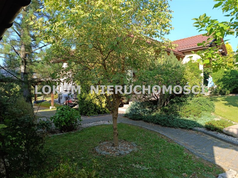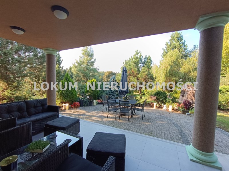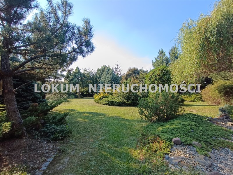Duża, zadbana i zagospodarowana działka, z licznymi wieloletnimi nasadzeniami, kaskada z wodospadem, w całości ogrodzona z automatyczną bramą wjazdową wykonaną z kutego żelaza.