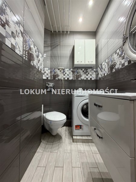 - łazienka + osobne WC (Łazienka w glazurze na wyposażeniu wanna, junkers, umywalka z szafką, lustro + WC na wyposażeniu sanitariaty oraz pralka)