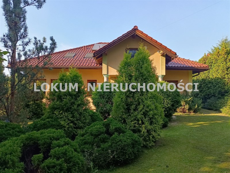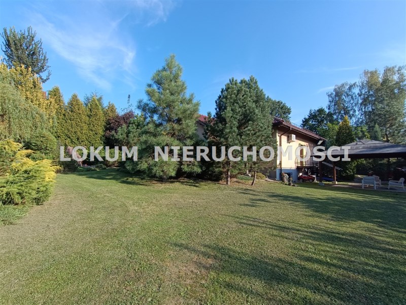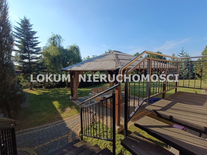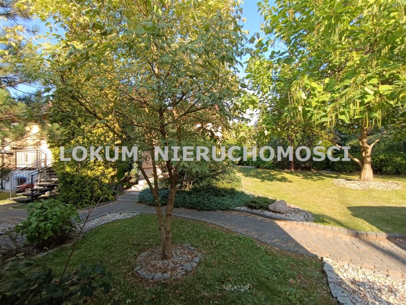 Duża, zadbana i zagospodarowana działka, z licznymi wieloletnimi nasadzeniami, kaskada z wodospadem, w całości ogrodzona z automatyczną bramą wjazdową wykonaną z kutego żelaza.