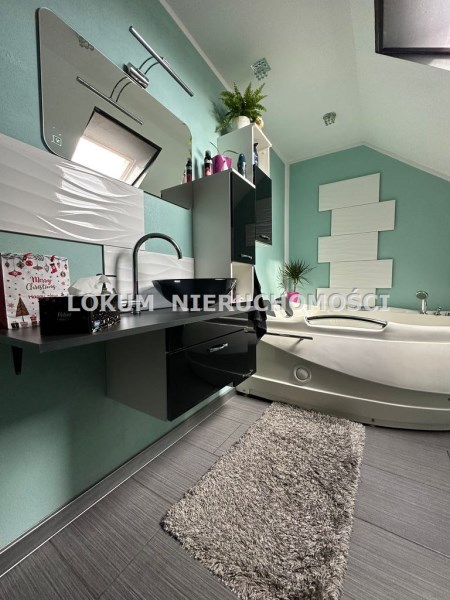 Na piętrze 2 sypialnie z tego jedna z nich z garderobą na ścianach gładzie na podłodze panele. Łazienka w glazurze na wyposażeniu duża wanna z hydromasażem.