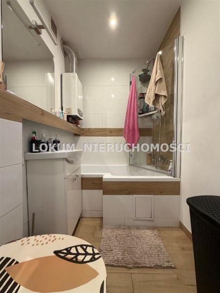 Łazienka wyposażona w wannę z parawanem, szafkę umywalkową oraz piecyk gazowy.
