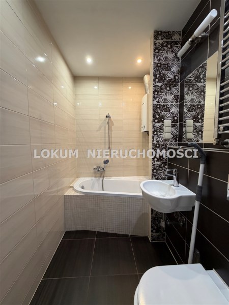 Łazienka wykafelkowana, wyposażona w wannę, umywalkę, wc podwieszane oraz piecyk gazowy.