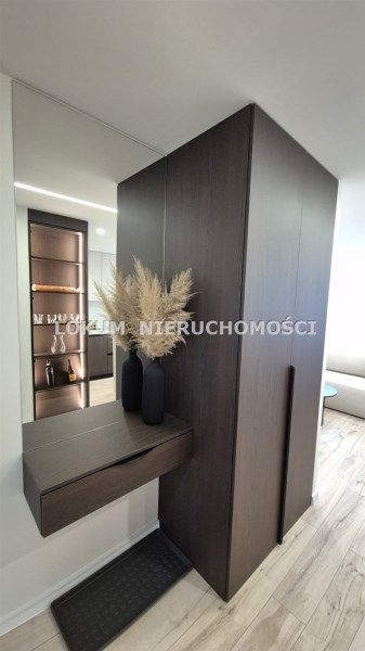 Przedpokój: duża szafa w zabudowie, dekoracyjne lustro.