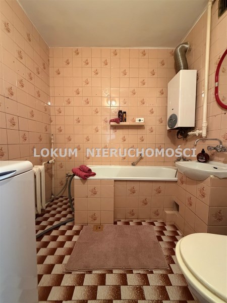 Łazienka w glazurze na wyposażeniu wanna, junkers, pralka oraz sanitariaty.